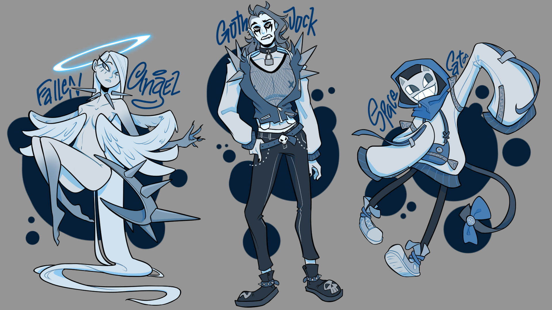 I have mostly made designs for school purposes, and commission works (most OC's of mine have their own ref sheets filed in my brain vault ;v; ), I like to play with silhouettes and try to avoid making 2 characters look-a-like. Colors play a big factor in completing the designs as well
